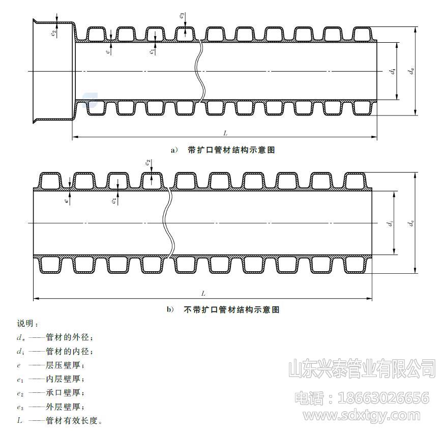 產品名稱:HDPE雙壁波紋管,聚乙烯雙壁波紋管 材料材質:PE/聚乙烯 執行標準:GB/T 19472.1 規格型號:DN/ID160-500mm(內徑系列) 環剛度等級:SN4,SN8 外觀顏色:外觀內壁均為黑色 產品長度:6米/支 連接方式:彈性密封圈 生產廠家:山東興泰管業有限公司 聯系電話:186 6302 6656 (高經理) 適用溫度:長期使用溫度45℃以下的埋地排水、排污和通訊護套管用管材 產品介紹: HDPE雙壁波紋管,簡稱PE波紋管,80年代初在德國首先研制成功,是一種以聚乙烯PE為原材料,經過擠出和特殊的成型工藝加工而成,內壁光滑,外壁為封閉波紋型的一種新型輕質管材,因采用了特殊的中空環形結構,具有優異的環剛度和良好的強度與韌性。具有重量輕、耐高壓、韌性好、施工快、壽命長、摩擦系數小、連接方便可靠等特點。其優異的管壁結構設計,與其它結構的管材相比,成本大大降低。雙壁波紋管已成為管道領域“以塑代鋼”的首選管材,它克服了混凝土管,鑄鐵管等安裝難度大、易銹蝕、水流阻力大、滋生細菌、壽命短的缺點。 PE雙壁波紋管是為了在節省原材料而不致使管材的環剛度下降的前提下,對管材截面進行優化設計的一種內壁光滑平整、外壁為梯形或弧形波紋狀、內外壁波紋間為中空、采用擠出成型工藝制成的管材。因為其主要原材料為聚乙烯(PE),故簡稱為PE雙壁波紋管。 PE雙壁波紋管內徑系列管材尺寸(單位:mm) 公稱內徑 DN/ID 最小平均內徑 dim,min 最小層壓壁厚 emin 最小內層壁厚 e1,min 最小外層壁厚 e3,min 最小結合長度 Amin 200 195 1.5 1.1 0.9 54 300 294 2.0 1.7 1.0 64 400 392 2.5 2.3 1.8 85 500 490 3.0 3.0 2.1 96 PE雙壁波紋管的優點 : 1、 產品結構獨特,抗壓能力強,具有足夠安全可靠的環剛度; 2、 節約原材料,用同樣的原材料做同一外徑的管材時,波紋管比實壁管節省30%以上的原材料; 3、 重量輕,比重小于鑄鐵管和水泥管的50%; 4、 內壁表面光滑,不易產生沉積,摩擦系數?。?/p> 5、 PE雙壁波紋管采用柔性密封圈連接,密封性能好,耐腐蝕,不結垢; 6、 具有良好的撓曲心梗,可適應土壤的不均勻沉降; 7、 連接便捷、施工進度快,與傳統水泥管相比,采用PE波紋管可以提高3倍以上安裝進度,明顯降低施工費用,縮短施工周期; 8、 生產成本低,埋地使用可達50年以上,綜合經濟性能優越。 PE雙壁波紋管的物理力學性能 項目 要求 環剛度/(kN/m2) SN4 SN8 ≥4 ≥8 沖擊性能(TIR)/ % ≤10 環柔性 管材無破裂,兩壁無脫開,內壁無反向彎曲 烘箱試驗 無分層,無開裂 密度/(kg/m3) ≤1180 氧化誘導時間(200℃)/min ≥20 蠕變比率 ≤4 PE雙壁波紋管的應用領域 : 1、 市政工程,用于建筑物的地下排水管、排污管、輸水管、通風管等; 2、 公寓、住宅小區、農村地下埋設排水排污; 3、 電器電信工程,作為電力電纜、通訊光纜、通訊信號電纜的保護管; 4、 工業,由于聚乙烯材料具有優良的耐酸、堿及耐腐蝕能力,結構壁管可用于化工、醫藥、環保等行業的給水和排水管道; 5、 農業、園林工程,用于農田、果園、茶園以及林帶排灌,可節水70%,節約用電13.9%,也可用于農村灌溉; 6、 道路工程,可用作鐵路、高速公路、高爾夫球場、足球場等的滲、排水管; 7、 礦場,用作礦井的通風、送風管、排水管。 PE雙壁波紋管的連接: HDPE雙壁波紋管管道接頭應采用彈性密封橡膠圈連接的承插式接口,橡膠圈接口應遵守下列規定: 1、接口前,應先檢查橡膠圈是否配套完好,確認橡膠圈安放位置及插口的插入深度。 2、接口時,先將承口的內壁清理干凈,并在承口內壁及插口橡膠圈上涂潤滑劑,然后將承插口端面的中心軸線對齊。 3、接口方法應按下述程序進行:DN400及其以下管道,先由一人用棉紗繩吊住被安裝管道的插口,另一人用長撬棒斜插入基礎,并抵住該管端部中心位置的橫擋板,然后用力將該管緩緩插入待安裝HDPE雙壁波紋管管道的承口至預定位置;DN400以上管道可用兩臺手扳葫蘆將管節拉動就位。接口合攏時,管節兩側的手扳葫蘆應同步拉動,使橡膠密封圈正確就位,不扭曲、不脫落。 PE雙壁波紋管貯存方法: HDPE雙壁波紋管應貯存于常溫干燥庫中,不宜暴曬。 HDPE雙壁波紋管應平放,堆碼高度不得超過4m。 HDPE雙壁波紋管不允許與有毒有害物質混放,應遠離熱源,在存放處應設置醒目的禁火標志。 存放期自生產之日起,一般不得超過2年。